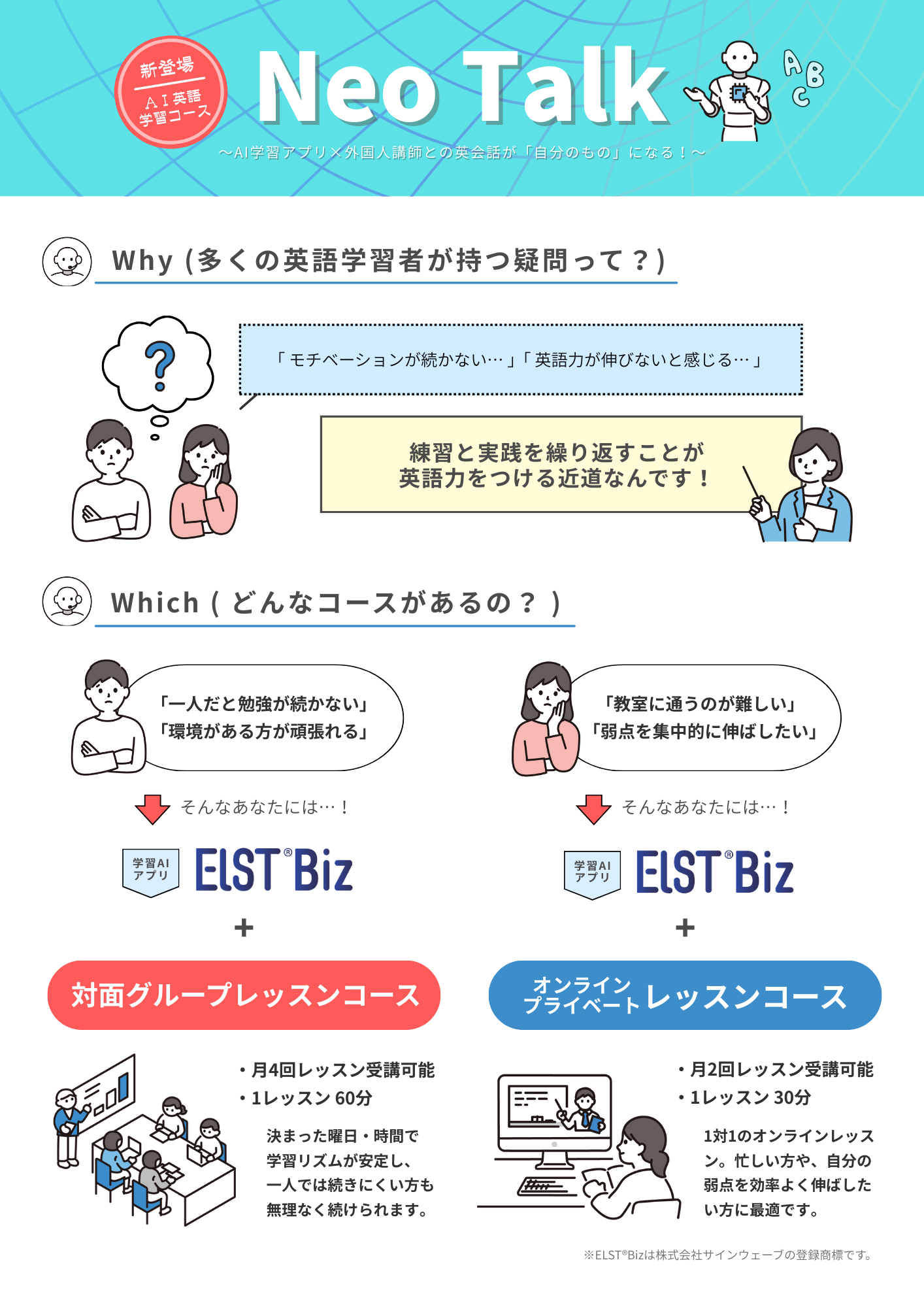 中学で使用する主要教科書の 3学年分の中で最も頻度が高く重要と思われる約1,000語を用いて基礎会話力アップを目指します。